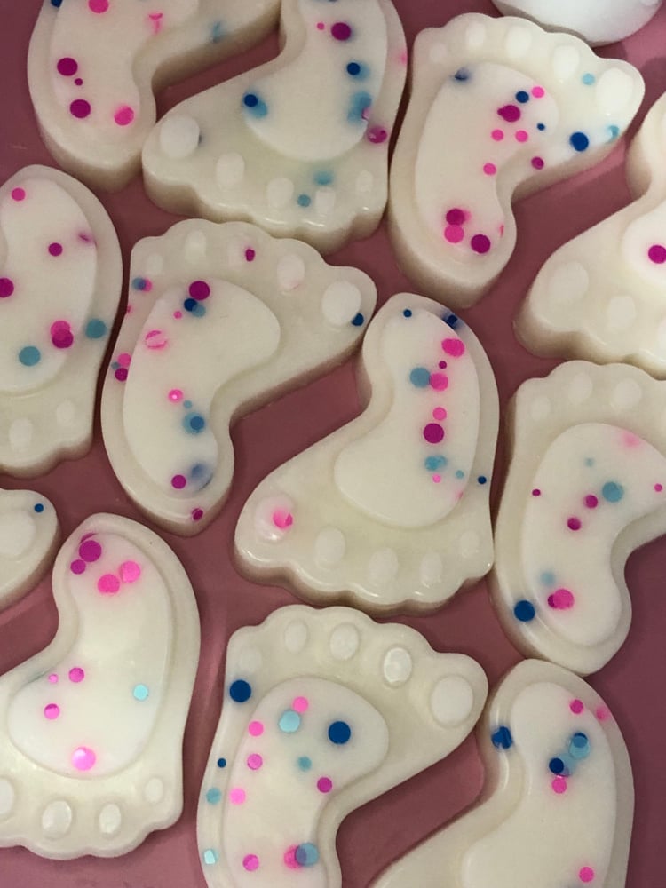 Baby feet shaped wax melts reduced to clear, just some that I have left over from a baby shower order, they come in a pink pouch of four baby feet shapes