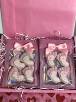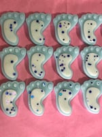 12 individually wrapped baby feet shapes in baby powder scent or 8 baby feet shapes in baby powder in a pretty slim gift box